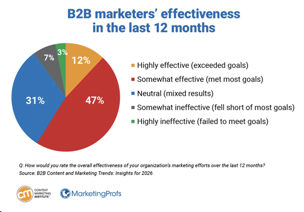 This is where many teams overestimate how well they’re doing. Research shows that only 12% of marketers say their content was highly effective over the last 12 months, while 47% say it was only somewhat effective.
